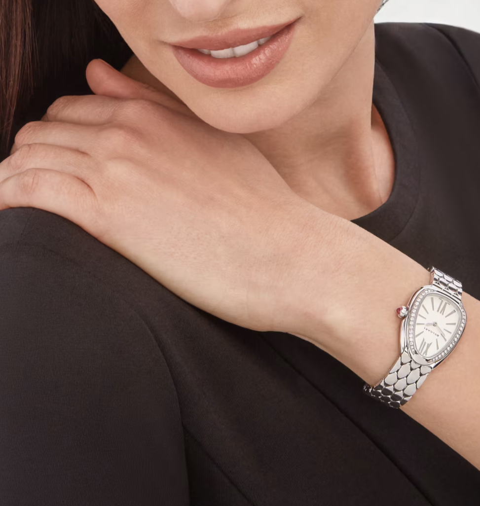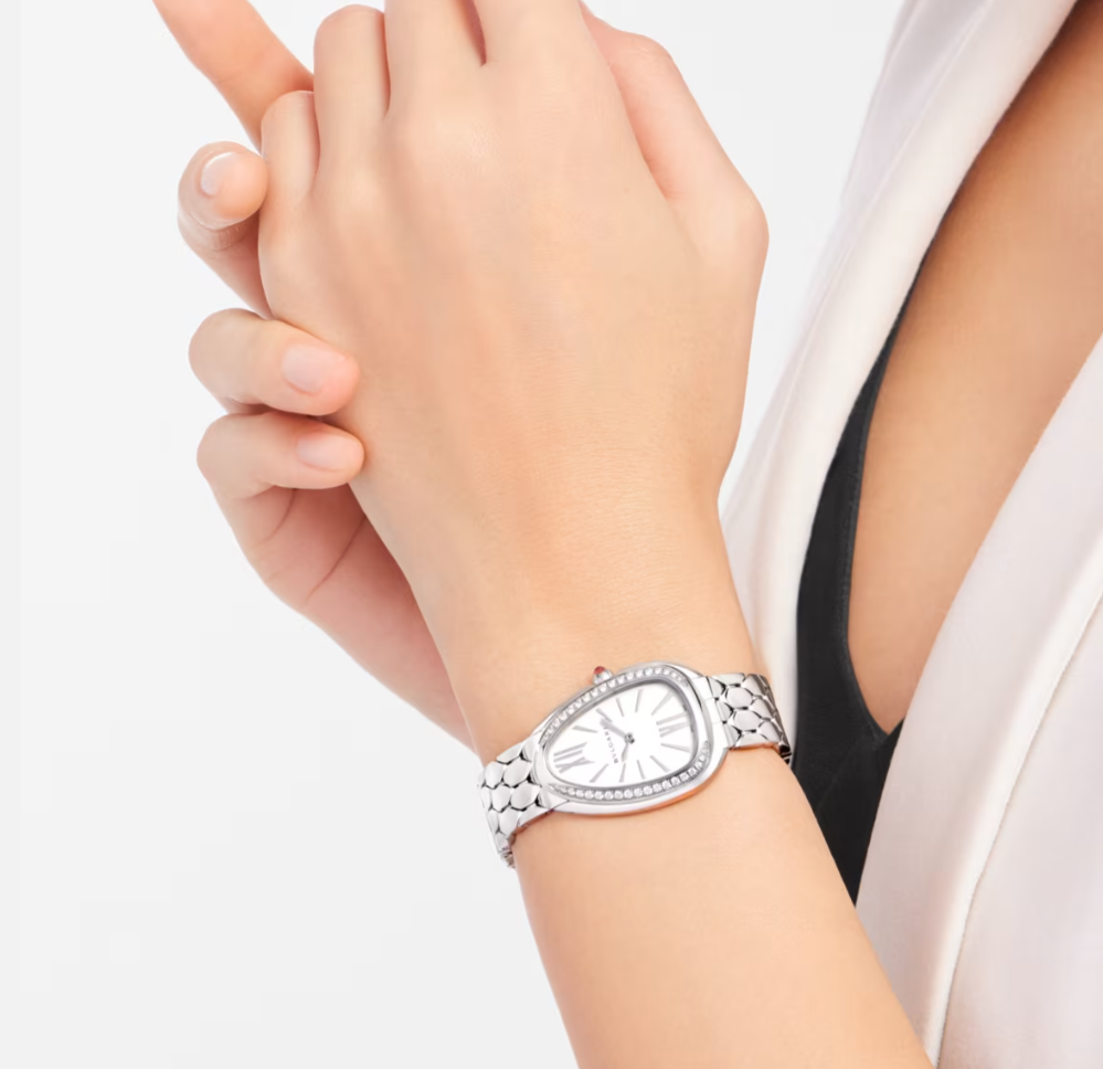 Gleaming with its refined sheen, the Serpenti Seduttori watch makes time even more precious. Reimagining Bvlgari’s indisputably seductive icon with a striking new design, the timepiece flaunts the famed drop-shaped watch head, thinner than ever before, along with a sensual, flexible bracelet embellished with a hexagonal pattern inspired by the serpent's scales. Alluring aesthetics and a nod to the glamor of Bvlgari's High Jewelry creations: this is the watch's captivating spell of seduction.