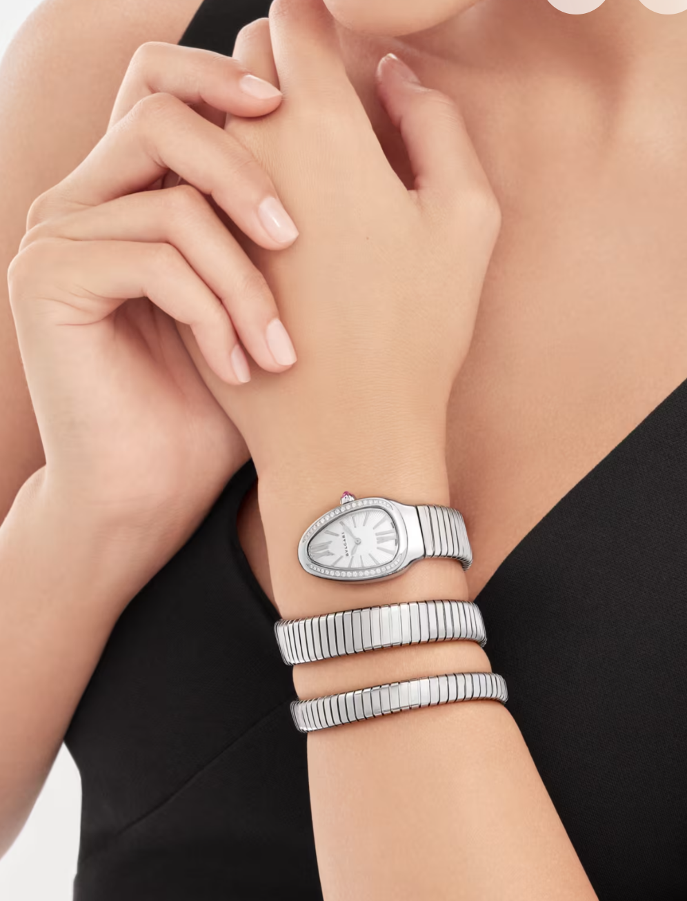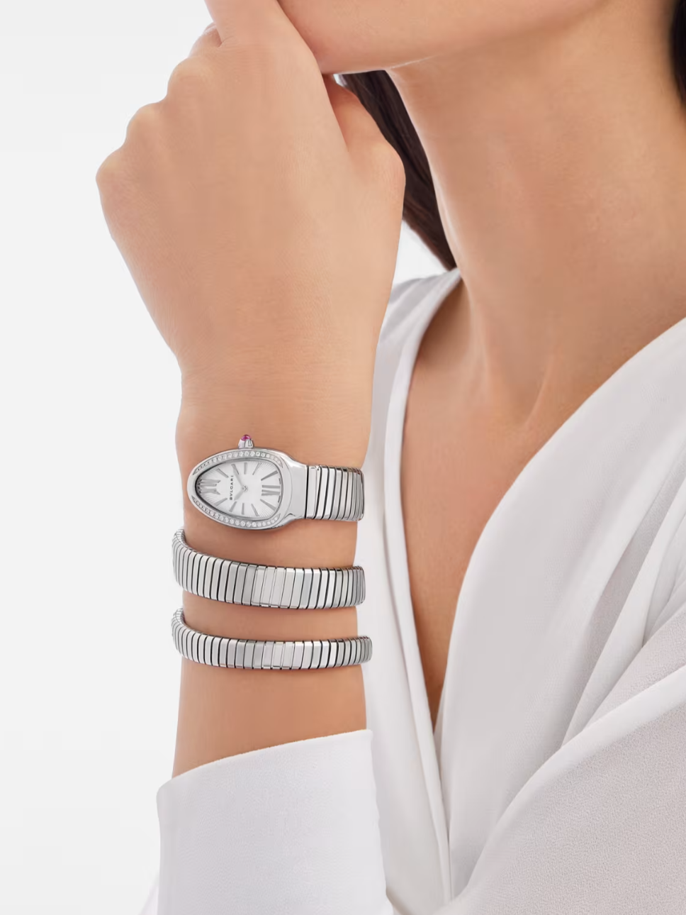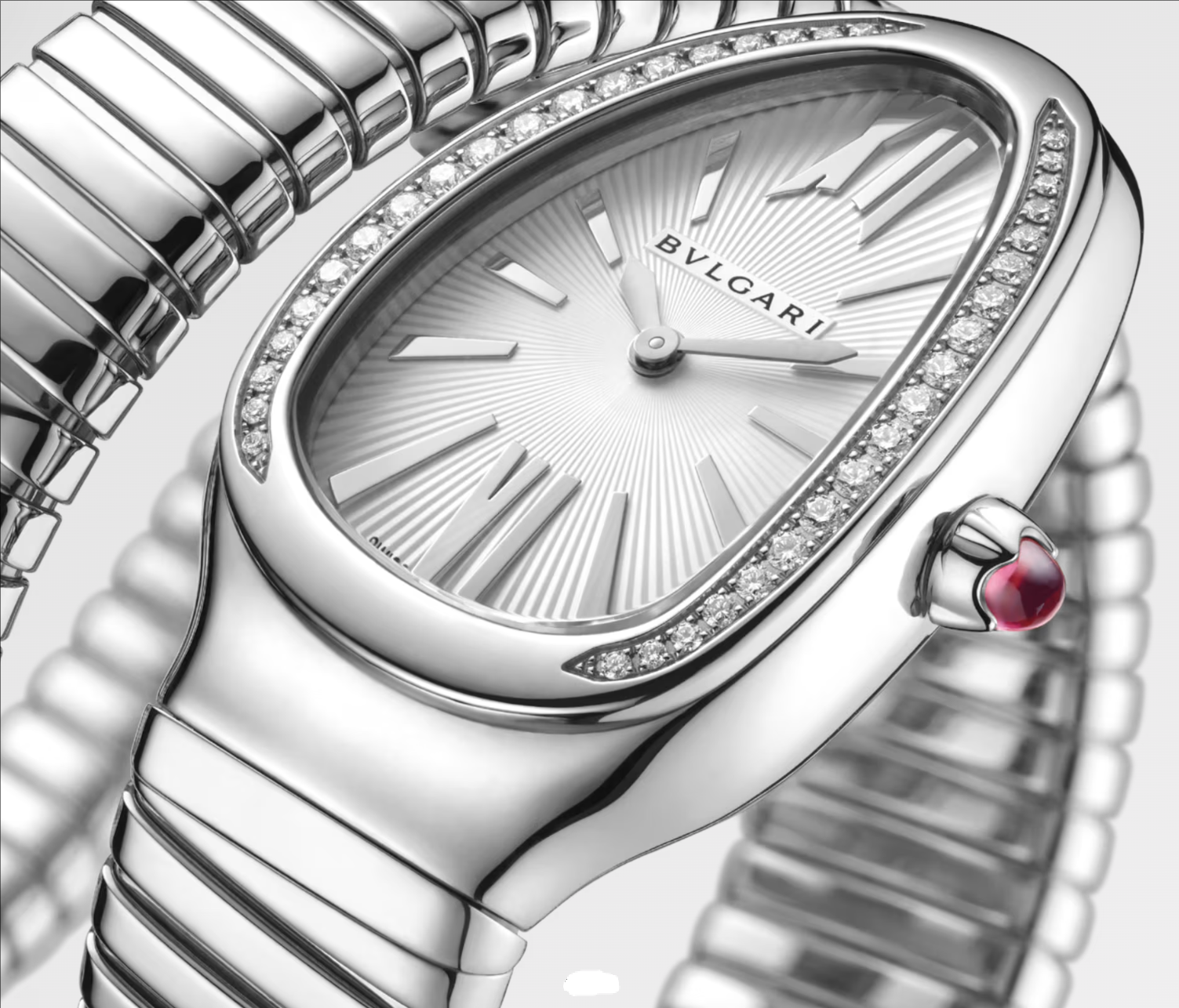 Merging two of the most iconic symbols of Bvlgari design, the Serpenti Tubogas watch coils the sinuosity of the snake with the contemporary soul of tubogas. Evoking both the sensual curves of a woman and the fluid shape of the serpent, the timepiece is crafted with the shapely lines of this specific technique, with a flexible and tubular litheness. Radiating glamour and a truly individual style, this watch marks a distinctive chapter in the constant evolution of Serpenti.