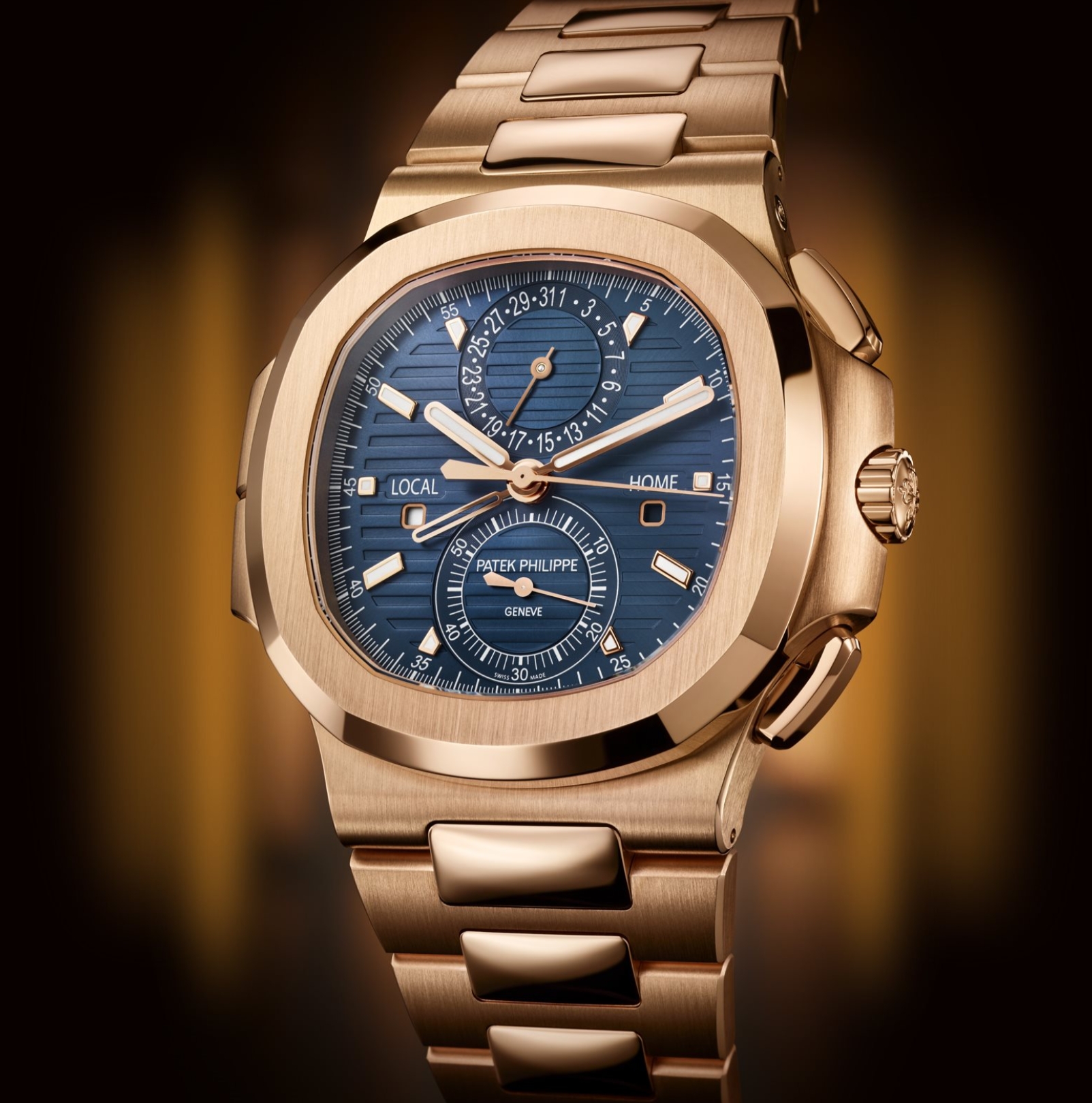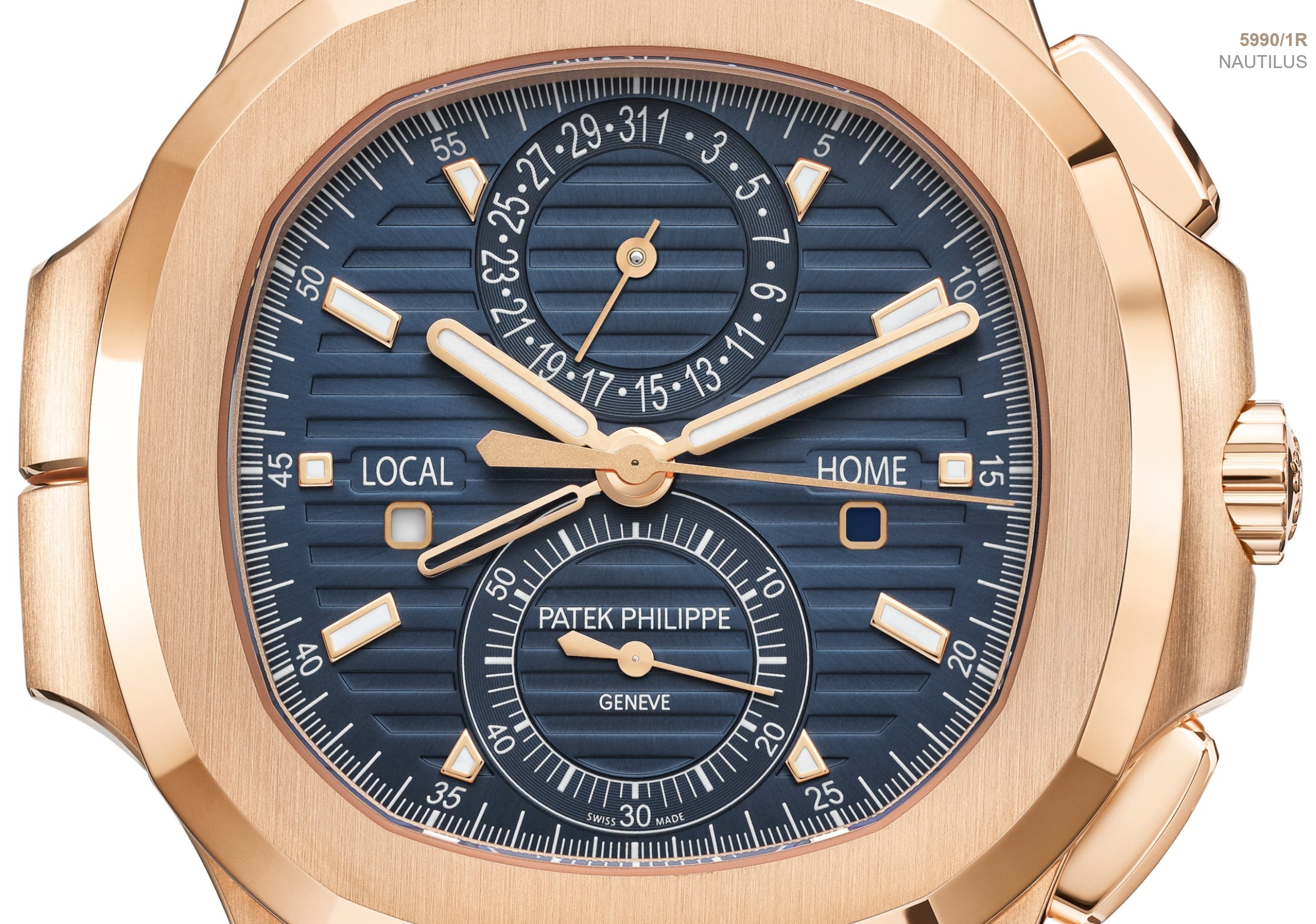 Patek Philippe launches the new Nautilus Travel Time Chronograph Ref. 5990/1 in rose gold, with a blue sunburst dial decorated with horizontal relief patterns and three-dimensional hour markers. The rose gold baton-style hands are coated with fluorescent coating. This new product cleverly combines three popular complex functions: automatic winding flyback chronograph, easy-to-use travel time (dual time zone display), and date display synchronized with local time.