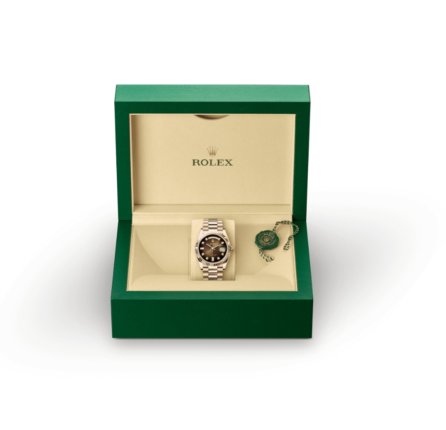The Rolex fluted bezel is a mark of distinction. Originally, the fluting of the Oyster bezel had a functional purpose: it served to screw the bezel onto the case helping to ensure the waterproofness of the watch. It was therefore identical to the fluting on the case back, which was also screwed onto the case for waterproofness, using specific Rolex tools. Over time, the fluting became an aesthetic element, a genuine Rolex signature feature. Today the fluted bezel is a mark of distinction, in gold on this Day-Date 40.