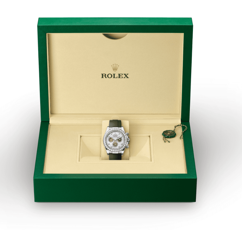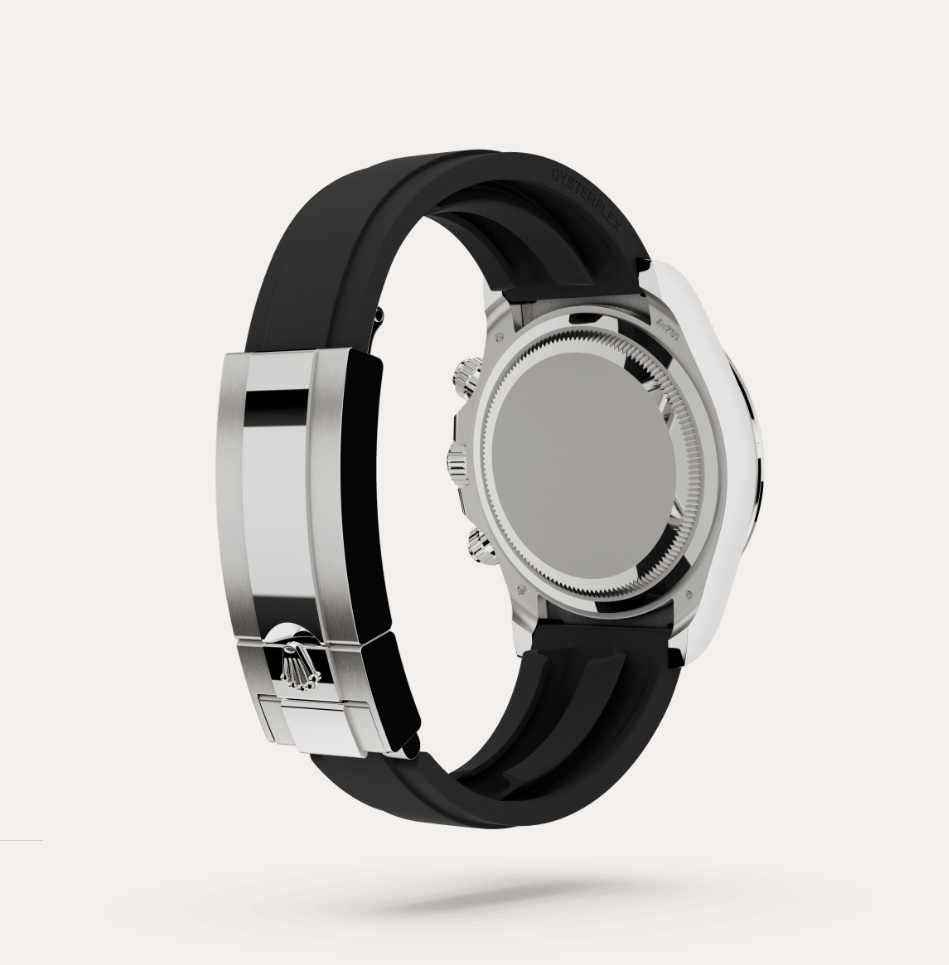 The 18 ct gold versions of the Cosmograph Daytona with a Cerachrom bezel are available with an Oysterflex bracelet. Developed by Rolex and patented, it singularly combines the robustness of a metal bracelet with the comfort of an elastomer bracelet. It is made up of two flexible curved metal blades – one in each bracelet section – overmoulded with high-performance black elastomer. For optimum comfort, the Oysterflex bracelet is equipped with cushions on its inner sides and an Oysterlock safety clasp to prevent accidental opening. Its length may be adjusted via the ingenious Rolex Glidelock extension system.